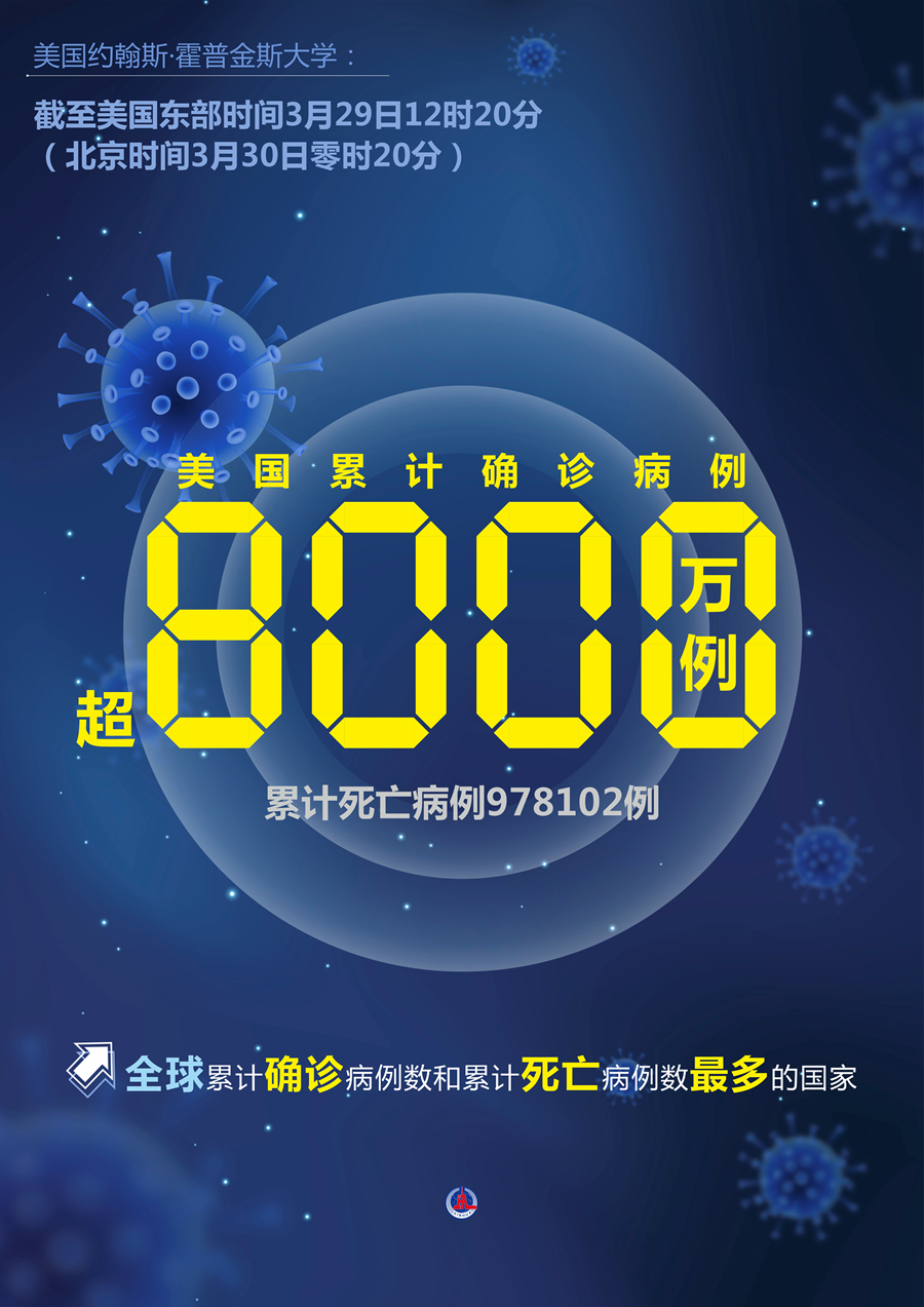 紐約3月29日電 美國約翰斯·霍普金斯大學(xué)29日發(fā)布的新冠疫情最新統(tǒng)計數(shù)據(jù)顯示,美國累計確診病例超過8000萬例。